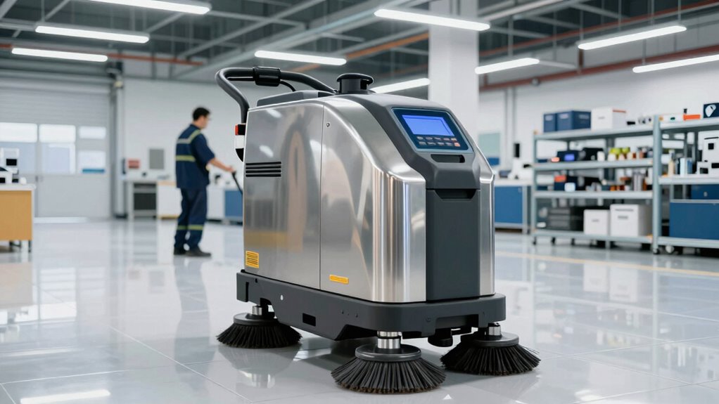 Selecting the right commercial floor scrubber is essential for maintaining a clean and safe environment in your facility. When choosing equipment, you need to consider how easy it is to maintain and how energy-efficient it is. Maintenance considerations are crucial because they affect the longevity of the machine, your ongoing costs, and the downtime required for repairs. Look for models with straightforward access to brushes, squeegees, and filters, which simplifies routine tasks. Machines with fewer moving parts or modular designs tend to be easier to service, saving you time and money. Additionally, check if replacement parts are readily available and affordable. Proper maintenance not only extends the lifespan of your scrubber but also ensures it operates at peak performance, keeping your floors consistently clean. Maintenance considerations are also influenced by design features that facilitate quick repairs and routine upkeep. Regular maintenance can also prevent costly breakdowns and improve overall efficiency.