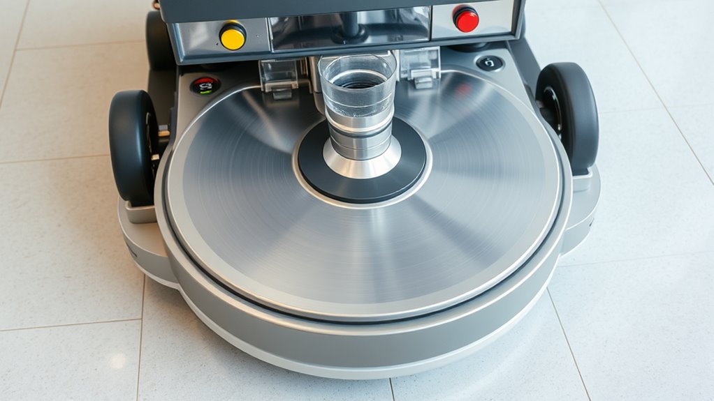 To keep your floor scrubber in top shape, regularly check the battery lifespan and recharge it properly to prevent damage. Clean the brushes and squeegees after each use, and inspect the filters for clogs. Consider eco-friendly options like biodegradable cleaning solutions to reduce environmental impact. Additionally, guarantee all moving parts are lubricated and perform periodic maintenance checks to prolong your scrubber’s life and maintain ideal performance.