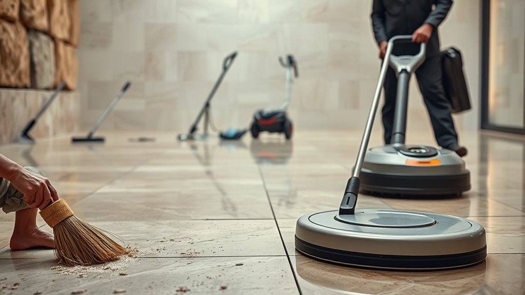 Fast forward to today, and you’re now witnessing a landscape dominated by advanced technology. Modern innovations have transformed floor scrubbing into a highly efficient, often automated process. Battery-powered scrubbers, robotic vacuum-scrubbers, and AI-driven cleaning systems now handle large areas with minimal human intervention. These machines incorporate sensors to navigate complex environments, ensuring thorough cleaning while optimizing energy use. The change from manual labor to lithium-ion batteries has made these devices lighter, more powerful, and longer-lasting. This technological leap allows for continuous, reliable operation, making cleaning faster and less labor-intensive than ever before. Additionally, the integration of advanced battery technology has greatly enhanced the performance and portability of these cleaning devices.