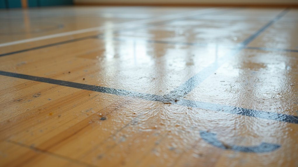 Yes, using too much water can cause water damage to rubber gym floors. Excess moisture can seep into seams and backing, leading to warping or deterioration over time. It’s also important to prioritize chemical safety; harsh cleaners combined with excessive water can damage the surface. Always use minimal water during cleaning, and opt for safe, pH-neutral solutions to preserve your flooring’s integrity and longevity.