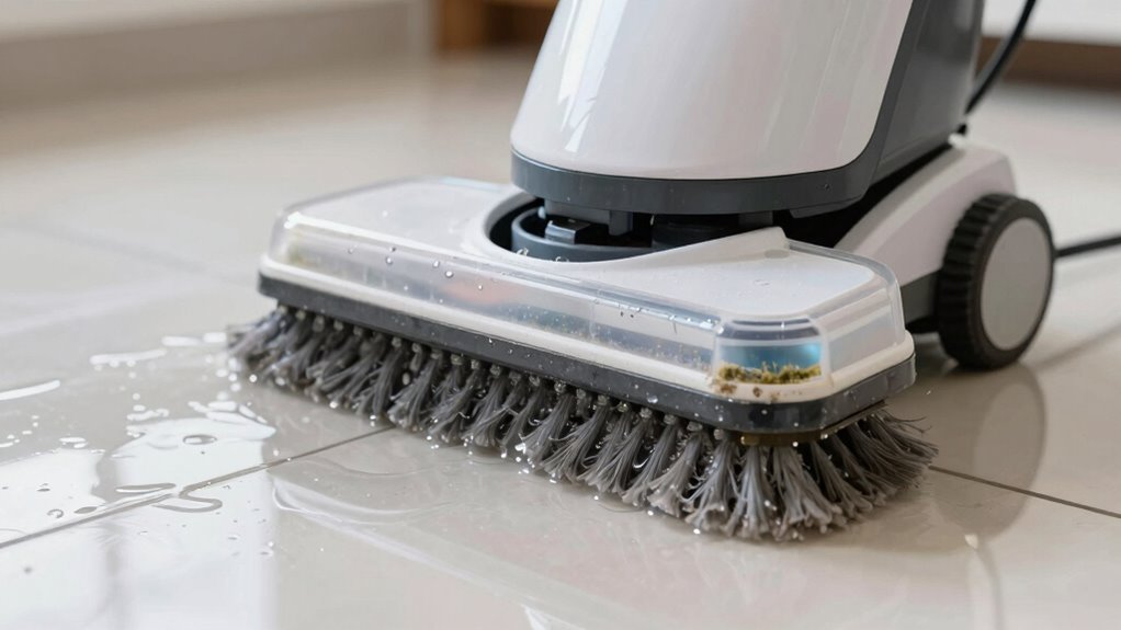 Hard water also affects detergent efficacy, which is vital for achieving a thorough clean. Many cleaning agents rely on water to create a lather that loosens dirt and grime. However, with mineral-rich water, the minerals react with the detergent, reducing its ability to foam and clean properly. You might find yourself using more cleaning solution than usual to compensate for the decreased effectiveness, which increases costs and can lead to residue left behind. This residual film can make floors look dull and streaked, defeating the purpose of a deep clean. You’ll spend more time rinsing and re-cleaning surfaces to get rid of streaks and spots caused by mineral deposits. Water treatment methods can help address these issues before they affect your cleaning routine. Regular use of descaling products can also prevent mineral buildup on your equipment and ensure optimal performance.
