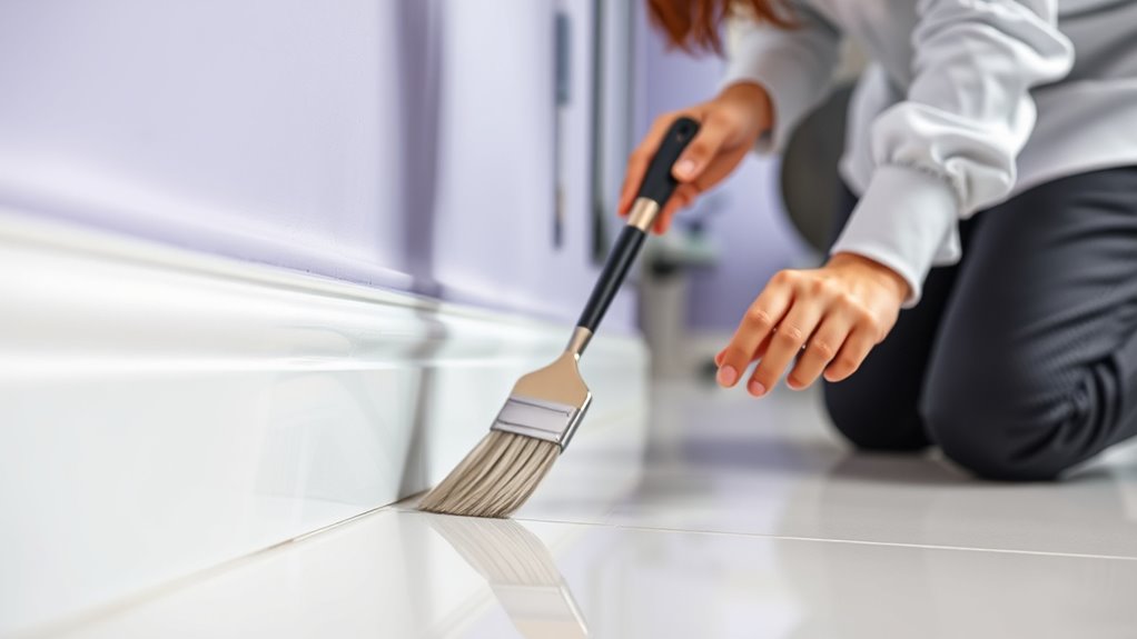 To guarantee a professional look, use small brushes or vacuums designed for baseboards to quickly remove dust and hair. Wear gloves and masks when handling chemicals or dust, and always inspect tools before use. Keep tools clean and in good condition, sharpening or replacing them as needed. Follow safety guidelines and take your time to avoid surface damage. Stay tuned—there’s more tips to help you master the perfect edge cleanup.