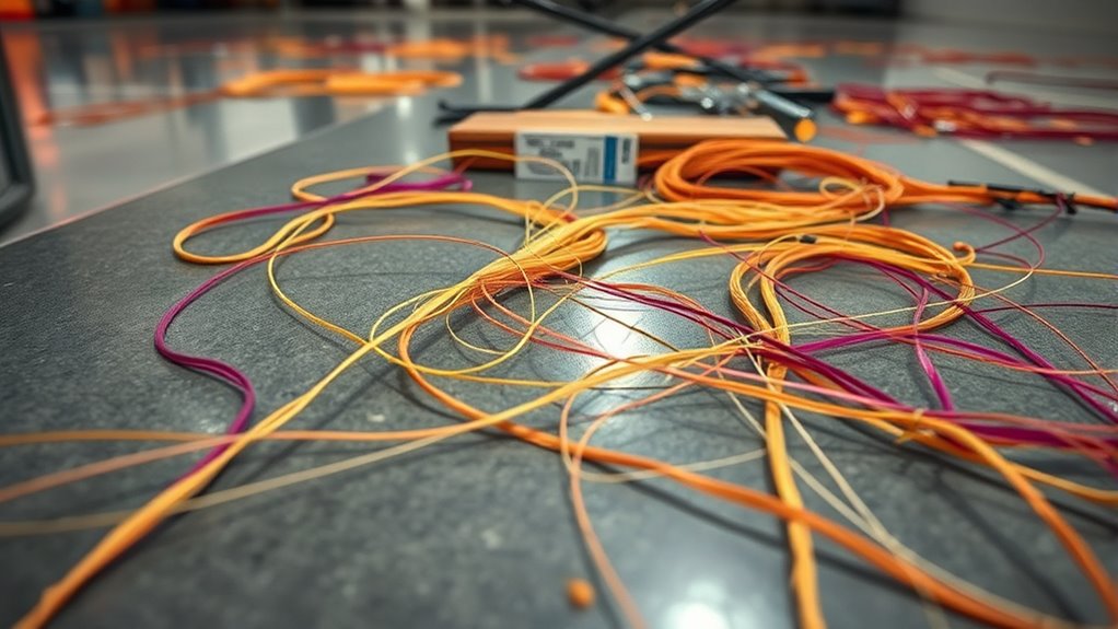 To remove hair and string from your garage floor without causing jams, start by sweeping the area with a stiff-bristled broom to loosen debris. Follow up with a shop vacuum to pick up small fibers, strands, and stubborn bits carefully. Avoid using a wet mop that can push fibers into cracks, and handle tangled debris with scissors or a utility knife for precision. Keep safety in mind, and you’ll prevent jams—more tips await if you continue exploring these easy, effective methods.
