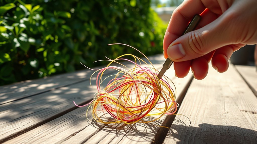 You can use tools like tweezers or a small, stiff-bristled brush to remove tangled hair efficiently. These tools help grip and pull out hair without damaging the string lights. For maintenance tips, regularly check and gently untangle hair with your chosen tools to prevent jamming. Using a pair of scissors to trim excess hair or string can also simplify future cleaning, keeping your outdoor patio lights looking neat and functioning properly.