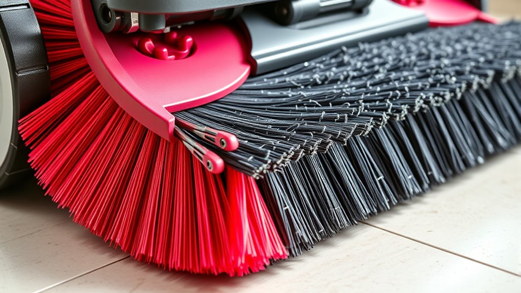 Understanding how side brooms and main broom angles work can considerably improve your vacuum’s cleaning efficiency. When you know how these components interact, you can optimize their performance to better pick up dirt, debris, and pet hair. One key aspect is understanding the broom material, as this influences durability and cleaning effectiveness. For example, rubber or silicone side brooms tend to glide smoothly over various surfaces, making them ideal for delicate floors. Meanwhile, bristled main brooms made of nylon or other stiff materials excel at agitating carpet fibers to dislodge dirt. Knowing the material helps you select or maintain the right broom for your flooring type and cleaning needs.