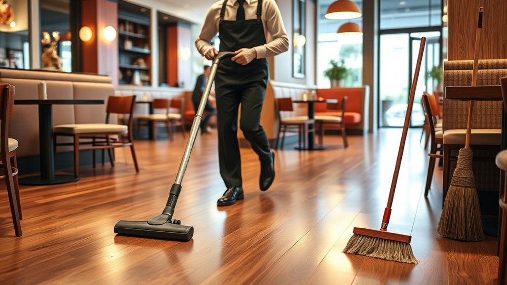 In an active cafe setting, customer safety should always be your top priority. Sweeping can quickly clear away surface debris, preventing slips or falls, especially on high-traffic floors. Yet, sweeping alone might not capture all the dust and tiny particles that settle into crevices or cling to carpets and rugs. This is where vacuuming becomes crucial. Using a commercial-grade vacuum with appropriate attachments guarantees you remove allergens, dust mites, and fine particles that could compromise air quality or trigger allergies. Regular vacuuming not only improves customer safety but also helps maintain a healthier environment for your staff.