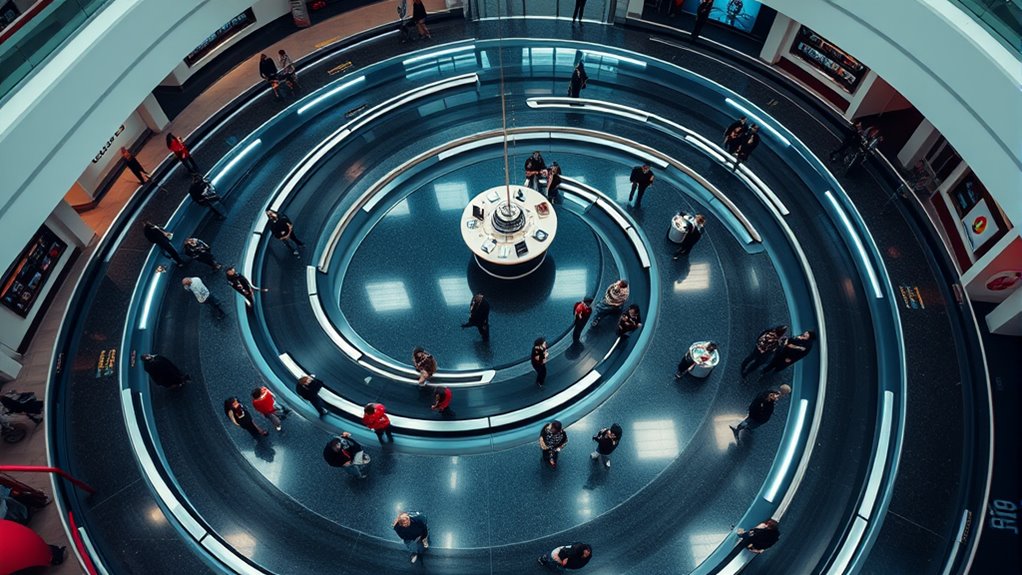 You can reduce congestion during cafe sweeps by designing clear exit points that streamline pedestrian flow. Use well-placed signage clarity to direct pedestrians efficiently, minimizing confusion and bottlenecks. Incorporate wide, unobstructed pathways and strategic positioning of exit points to guarantee smooth movement. By focusing on clear signage and thoughtful layout, you help pedestrians shift seamlessly, preventing backups and keeping the sweep process swift and safe.