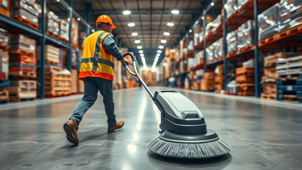 Balancing sweeping speed and debris pick-up is key to warehouse safety and efficiency. Moving too fast may leave debris behind, posing hazards, while sweeping too slowly slows operations. Improving equipment setup, maintaining tools, and training operators help find that perfect middle ground. It’s also essential to monitor operator fatigue, as tired workers can miss debris or make errors. Keep this balance in mind, and you’ll keep your warehouse clean and productive—discover more ways to optimize your process below.