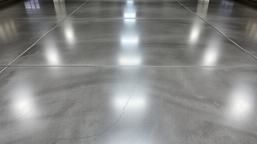 Dry the surface with a microfiber cloth or a soft mop to prevent water spots and streaks. After cleaning, inspect the surface for any areas that might need resealing. Proper sealing techniques are vital because they help lock in the cleanliness and prevent future stains. If you notice your sealer has worn or become dull, reapply a compatible penetrating or topical sealer according to the manufacturer’s instructions. This step not only enhances the appearance but also provides a protective barrier against spills, dirt, and stains, making future cleaning easier. Remember, regular maintenance combined with careful stain removal and sealing will keep your polished concrete looking its best for years to come. When you pay attention to these details, you’ll preserve the smooth, glossy finish without risking damage to the surface.