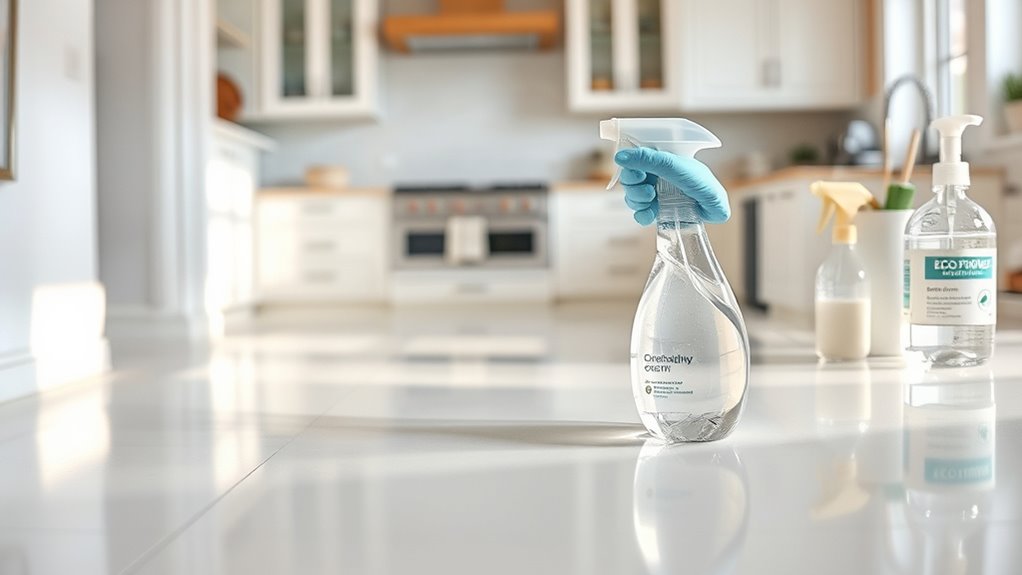 To keep your linoleum floors safe and spotless, choose gentle disinfectants like diluted vinegar or specialized floor cleaners, and avoid harsh chemicals. For example, if you used bleach frequently, it might damage your floor over time. Instead, opt for safe options to preserve its beauty and longevity. By being mindful, you guarantee your floors stay clean and vibrant for years to come, just like the homeowner who switched to a milder cleaner and saw their floor’s color stay bright.