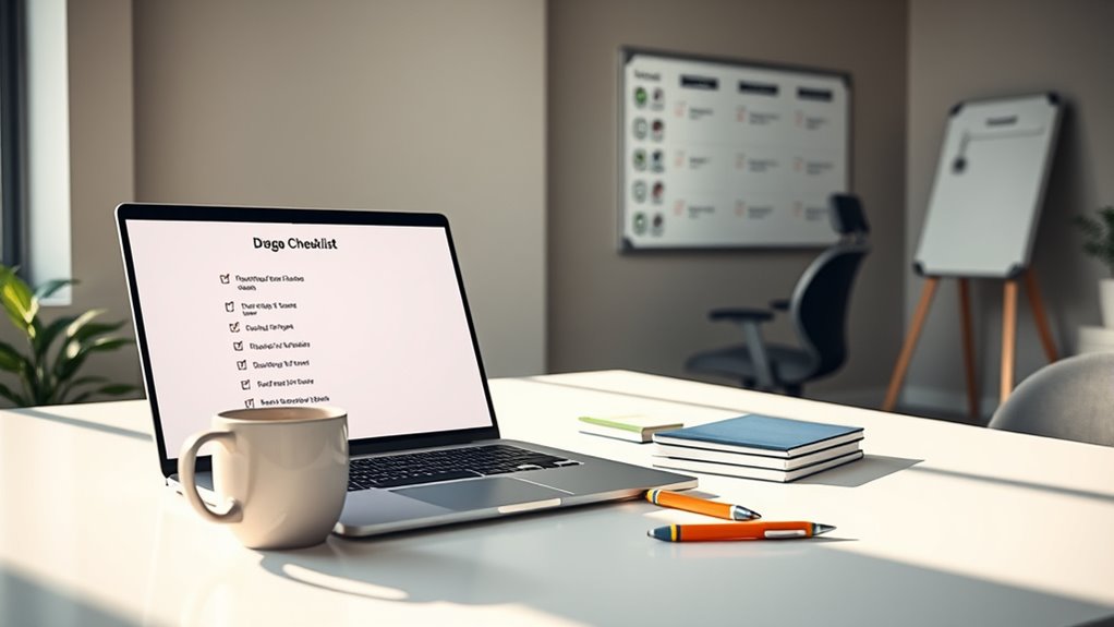 To efficiently complete your checklist, you’ll want digital tools that streamline the process. Using checklist automation software saves time and reduces errors by digitizing tasks. These tools can send reminders, track progress, and organize your daily routines, making sure nothing gets overlooked. With the right digital tools, you’ll stay consistent and productive, ensuring your daily tasks are completed swiftly and accurately every day.