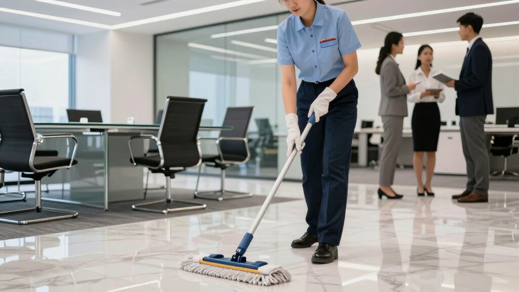 Planning your cleaning activities around your business hours is also imperative. Break down tasks into manageable segments, allowing your team to clean high-traffic areas during slow periods, while leaving less busy zones for later. Communicate clearly with staff about their roles and schedules, so everyone is aligned. This way, cleaning becomes part of your daily routine rather than a disruptive event. With these strategies—focused on equipment maintenance and employee training—you guarantee that your floors stay spotless without interfering with your business operations.