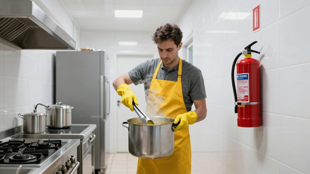 In addition to cleaning equipment, maintaining and inspecting your ventilation systems is essential. Grease and grime tend to clog vents and exhaust fans over time, reducing airflow and increasing the risk of fire hazards. Regularly check your ventilation systems for signs of grease buildup. If you notice a greasy film or a decrease in airflow, it’s time for a thorough cleaning. Turn off the ventilation system before cleaning to avoid spreading grease particles into the air. Use appropriate tools, like brushes and degreasers, to scrub exhaust hoods, filters, and ducts. Consider scheduling professional cleaning periodically to guarantee your ventilation system remains effective and free of dangerous grease deposits. Incorporating regular maintenance routines can significantly prevent the accumulation of grease and extend the lifespan of your ventilation systems. Additionally, understanding the importance of proper ventilation system maintenance can help you develop a comprehensive plan for a safer kitchen environment. Regularly inspecting and cleaning these systems also helps prevent fire hazards caused by grease buildup, which is a critical safety concern. Staying informed about grease accumulation and its risks is essential for proactive kitchen safety.
