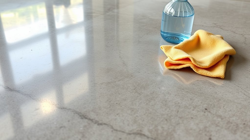 Stuck with stubborn stains on your polished concrete? Think of stain removal as a battle where patience wins. Start with a gentle cleaning technique using a pH-neutral cleaner, then apply a poultice or a mix of baking soda and water for tougher spots. Let it sit, then scrub gently. For persistent stains, repeat the process. With careful stain removal, your concrete can regain its shine effortlessly.