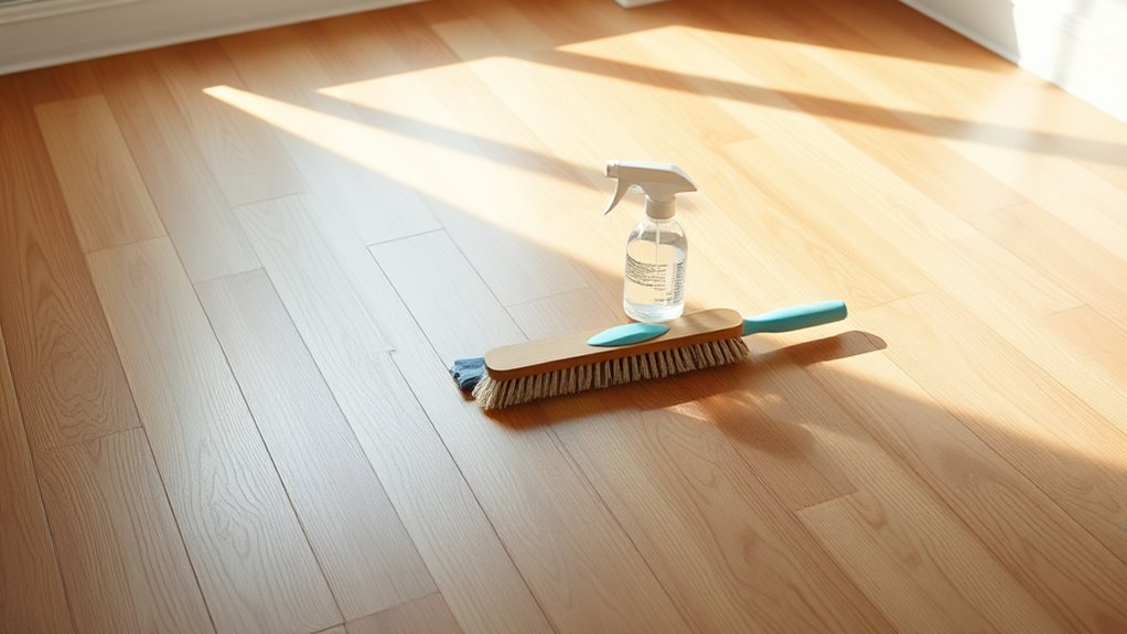 Before you start scrubbing, clear the area of furniture, rugs, and decorations. Sweep or vacuum thoroughly to remove loose dirt, dust, and debris, preventing scratches and making cleaning more effective. Mix your cleaning solution according to the manufacturer’s instructions, and test it on a small hidden area to check for damage. By properly prepping the surface, you’ll guarantee a deeper clean and protect your floors—learn more about the best techniques to achieve spotless results.