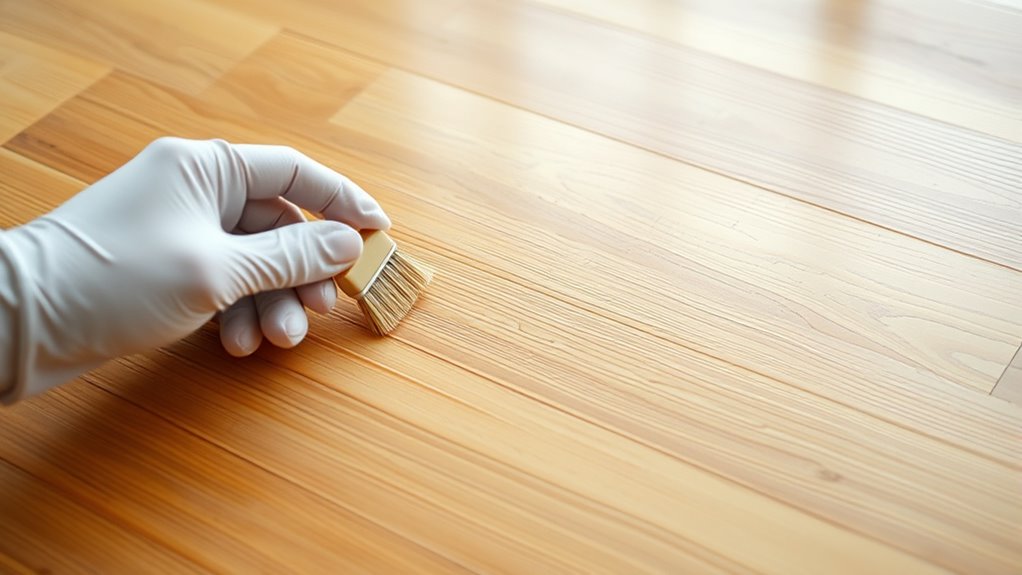 In an age where even a knight’s armor needs polishing, you can hide scratches with household items through DIY scratch repair. Use a walnut or almond to gently rub over minor scratches—natural oils help blend the mark. Furniture touch ups with a matching crayon, wood marker, or even a touch of coffee can conceal deeper scratches. These simple tricks make your bamboo floors look fresh without professional help.