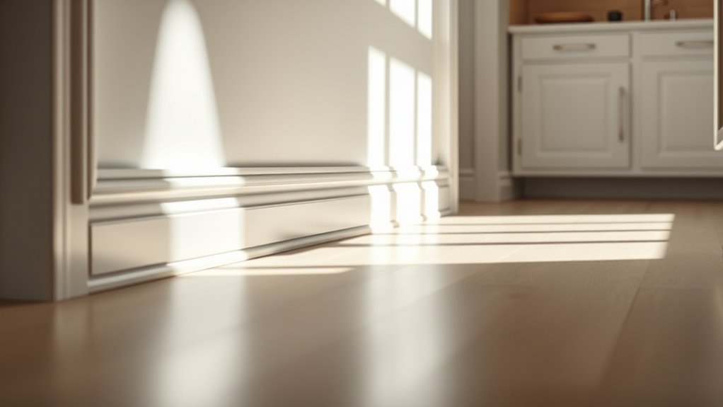 Protect your baseboards by prioritizing proper placement, pre-installation prep, and protective panels. Start with smart spacing, ensuring they’re securely installed without gaps. Use durable, pet-proof materials like rubber or vinyl that resist scratches and bites. Apply adhesive strips or guards to keep pets from clawing or chewing. Regularly inspect and maintain the baseboards, reinforcing their resilience. With these tactics, you prevent pet damage, prolonging your baseboards’ beauty and durability.