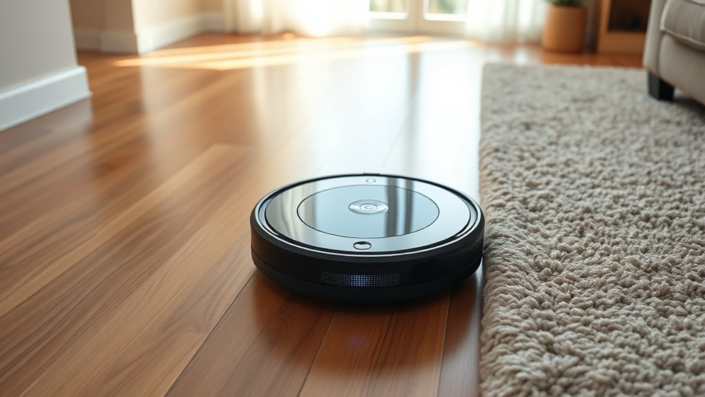 Effective floor transition strategies also involve planning your space’s layout. Clearing clutter and marking high-traffic or sensitive areas helps your robot navigate more confidently. Regularly cleaning its sensors and updating its mapping software ensure it maintains accurate awareness of your home’s layout, which is essential for handling mixed surfaces. Additionally, placing boundary strips or virtual barriers can help guide the robot away from areas where transitions are tricky or where specific cleaning modes aren’t suitable.