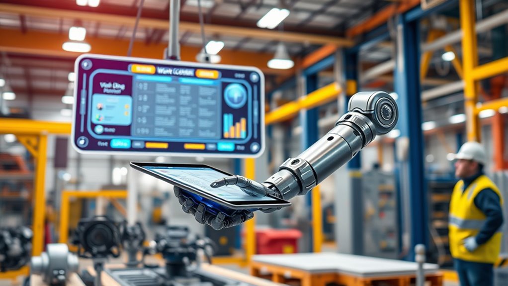 Integrating robots with CMMS and work orders streamlines your maintenance workflows by automating routine inspections, repairs, and scheduling based on real-time data and performance metrics. This integration reduces downtime, boosts safety by handling dangerous tasks, and guarantees accurate documentation for accountability. It also enables predictive maintenance and rapid technician responses, allowing your team to focus on more complex issues. Keep exploring to discover how this setup can transform your maintenance operations even further.