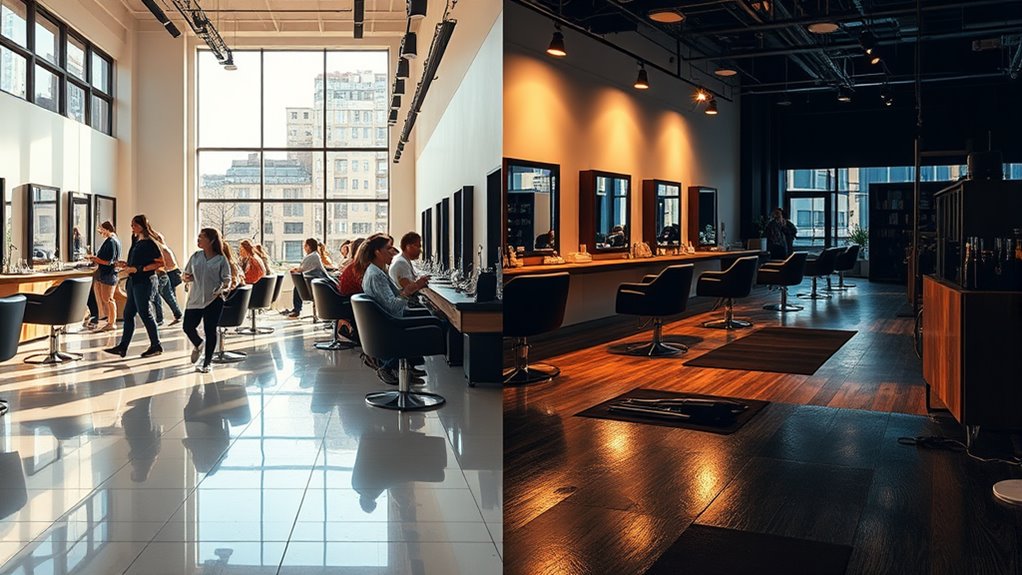 balancing day and night salon runs can boost your client flow and revenue while maintaining a good work-life balance. During the day, you’ll handle scheduled appointments that keep things running smoothly and efficiently, with a lively atmosphere. Night shifts offer flexibility for longer, detailed treatments and personalized service, though they may impact your personal schedule. To optimize your salon, understanding these differences will help you create the best schedule — keep exploring for more tips.