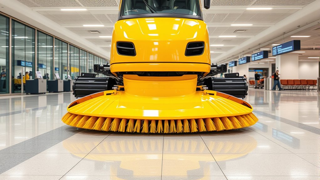 Imagine a cleaning machine seamlessly gliding over smooth tiles and textured concrete, adapting effortlessly to each surface’s unique feel. With advanced cleaning technology, these machines utilize surface adaptability, adjusting brush pressure and spray intensity in real-time. You can trust that they deliver efficient, thorough cleaning, regardless of the airport surface type. Their smart sensors ensure peak performance, making maintenance faster and more effective, leaving your airport spotless and safe.