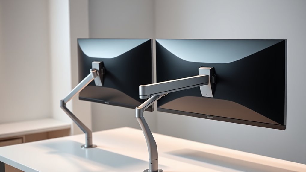 The adjustability and range of a monitor arm directly impact how comfortably you can customize your workspace. I look for arms with a wide tilt, swivel, and rotation range to suit different ergonomic needs. Height adjustment is vital, ideally supporting at least 10-20 inches of vertical movement, so I can position monitors at eye level easily. Full-motion arms with gas spring or pneumatic systems make adjustments smooth and screw-free, which I find much more convenient. It’s also important that the arms support ample extension length, allowing monitors to be positioned comfortably at various distances. Ultimately, I check for versatile degrees of movement—such as +/- 90° tilt, 180° swivel, and 360° rotation—to guarantee maximum flexibility in positioning my dual monitors for work or leisure.
