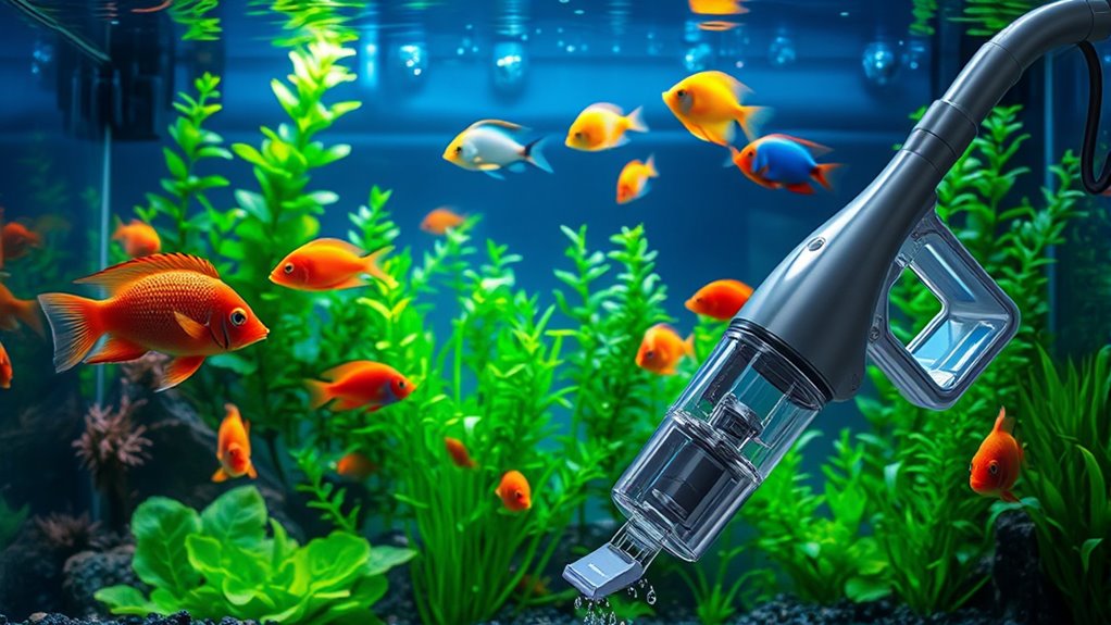 You might worry about electric shocks, but safety is simple. I always unplug the vacuum before starting, keep my hands dry, and avoid operating near water splashes. Using a grounded outlet and inspecting the cord for damage also helps prevent accidents. Following these precautions guarantees I clean my tank safely and effectively, giving me peace of mind while maintaining my aquarium’s health.