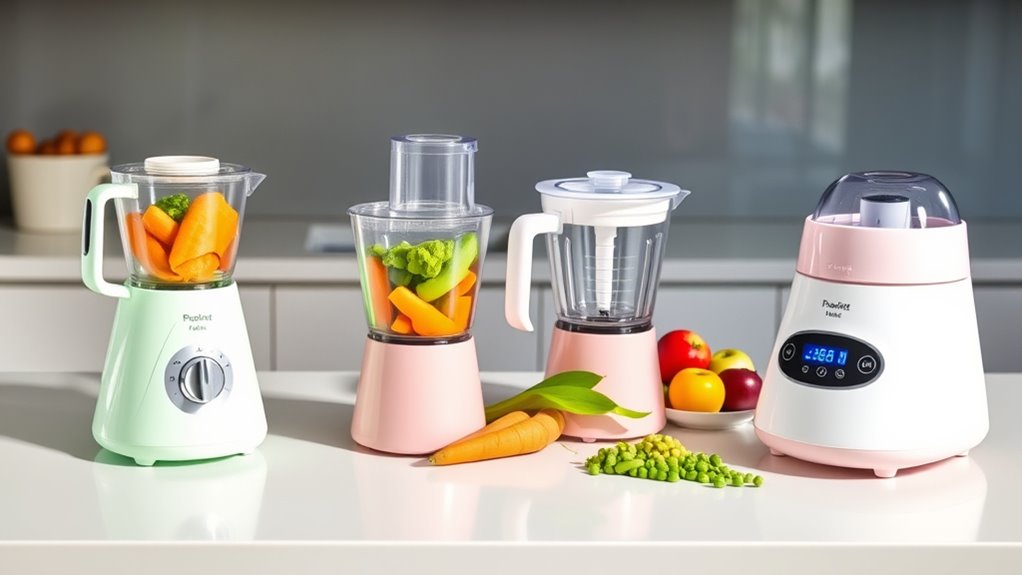When choosing a baby food maker or blender, power and speed are crucial factors that directly impact performance. A higher wattage motor provides more power, allowing me to process tougher ingredients like meats and frozen foods quickly and smoothly. Multiple speed settings give me control over the texture, whether I want a silky puree or chunkier pieces. Faster processing speeds cut down meal prep time, so I can serve fresh food faster. Pre-programmed or auto-blend cycles help optimize speed and consistency for different food types, making the process even easier. The motor’s RPM also influences fineness; higher RPMs typically produce smoother purees more efficiently. Overall, a powerful and fast blender ensures I can prepare healthy, homemade baby food with less effort and in less time.