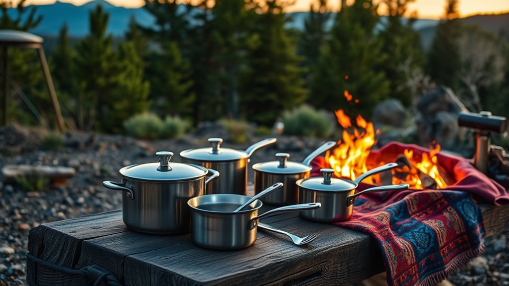 Choosing the right camping cookware set is like finding the perfect campsite—bright enough to light your way, yet cozy enough to feel at home. Whether you prefer lightweight aluminum or sturdy stainless steel, each option brings its own charm to your outdoor table. Think of it as assembling a small, reliable family that’s ready to serve up memorable meals amidst nature’s embrace. With the right set, your outdoor adventures will feel just a bit more like coming home.