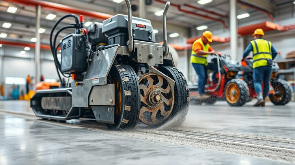 Have you ever wondered how much dust a concrete scarifier generates and whether it’s effectively contained during operation? Dust collection efficiency is vital for a cleaner, safer workspace. High-quality systems use vacuum attachments or shrouds to trap over 95% of dust, considerably reducing airborne particles. Ensuring a proper seal around the shroud and tight-fitting vacuum hoses is essential to prevent leaks and maximize dust capture. Regular maintenance of these components keeps the system working at peak performance and prevents clogging. Some advanced models even feature HEPA filters, which trap the finest dust particles, improving air quality and operator safety. When choosing a machine, look for a high-efficiency dust collection system that minimizes mess and health risks, making your project safer and more efficient.
