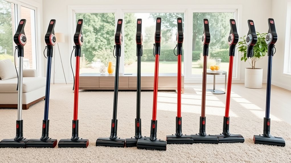 Imagine gliding effortlessly across your carpet, pet hair vanishing with each pass—that’s how effective these vacuums are. They excel at picking up pet hair and allergens, thanks to powerful suction and specialized brushes. I’ve found they markedly reduce allergens in my home, making breathing easier. While no vacuum is perfect, these models handle pet hair and allergens impressively well, giving me peace of mind and a cleaner space.