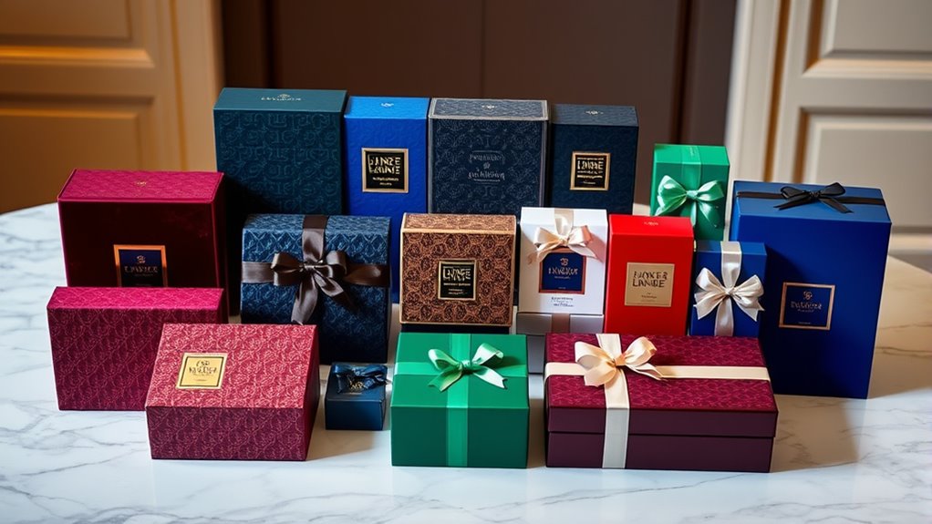 Since scent longevity is a key factor in gift-giving, I pay close attention to the concentration and quality of the fragrance when selecting a designer gift box. Fragrances with higher oil concentrations, like Eau de Parfum or Parfum, tend to last 6-8 hours or more, making them ideal for lasting impressions. The quality of ingredients also plays a vital role; higher-quality components provide a richer, more enduring aroma. Skin type influences longevity too—oily skin retains scents longer than dry skin. Proper storage, away from heat and light, preserves scent integrity over time. Additionally, a fragrance’s composition—especially the base notes—determines how long the aroma stays noticeable. Considering these factors guarantees the gift remains luxurious and memorable well beyond the initial application.
