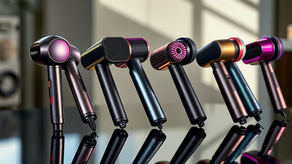 Choosing the right Dyson Airwrap alternative starts with ensuring compatibility and the right attachments. First, make certain the device matches your specific Dyson Airwrap model—HS01, HS05, or HS08—to guarantee proper fit and functionality. Check if the alternative includes a variety of attachments like curlers, brushes, and diffusers to suit your styling needs. It’s also important that these attachments work seamlessly with the device’s airflow and heat controls for the best results. Consider whether the product offers specialized tools like auto-wrap curlers or volumizing brushes for added versatility. Finally, verify that replacement attachments are easily available and compatible over time, so you can maintain your styling routine without hassle. Proper compatibility and versatile attachments are key for a satisfying styling experience.