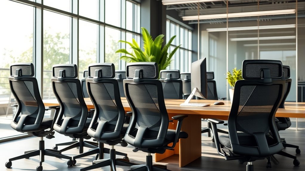 Like a well-tuned instrument, these chairs hit the right notes with ergonomic standards and certifications. I’ve checked, and they meet industry benchmarks like BIFMA, ANSI, and ISO for safety, comfort, and support. You can trust that they’re designed with proper lumbar support, adjustable features, and health-conscious materials. Rest assured, these chairs aren’t just stylish—they’re built to keep you comfortable and supported through long workdays.