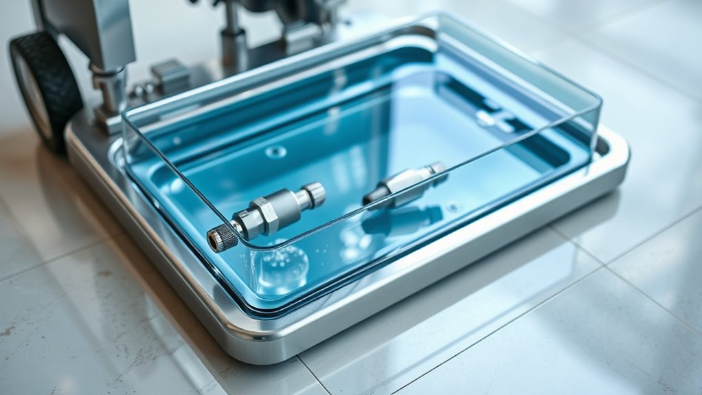 Maintaining your floor scrubber’s water recovery tank is vital for keeping it running smoothly and guaranteeing peak cleaning performance. Regularly inspecting and cleaning the tank prevents debris buildup that can impair suction and cleaning efficiency. Look for kits with easy-to-disassemble components; this makes routine maintenance quicker and less cumbersome. Choosing tanks made from durable, chemical-resistant materials like polypropylene or polyethylene prolongs their lifespan and reduces cleaning frequency. It’s also essential to keep replacement filters and seals on hand to maintain hygiene and prevent contamination. After each use, guarantee you drain and sanitize the tank to prevent odors and bacterial growth, which can shorten the scrubber’s life. Proper cleaning and maintenance keep your equipment functioning at its best and extend its longevity.