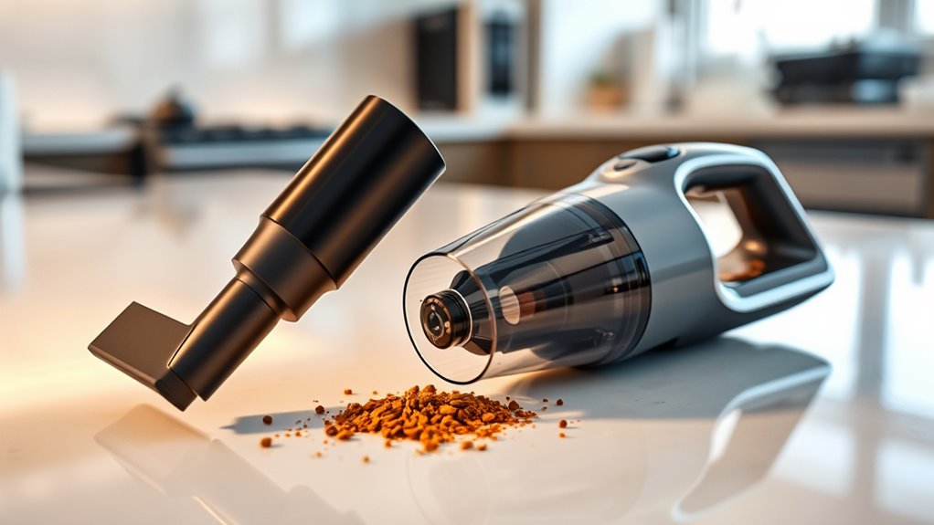 Choosing a handheld vacuum with strong suction also means considering how easy it is to keep it in top shape. Washable HEPA filters and reusable parts make maintenance straightforward and save money over time. An easy-to-empty dust cup or bag means quick disposal without mess or tools, which is especially helpful during cleanup. Devices with one-click filter removal and cleaning features let me maintain my vacuum efficiently, saving valuable time. Compact designs usually provide simple access to filters and debris chambers, making regular upkeep hassle-free. Regularly cleaning filters and emptying the dust container are essential to keep suction power strong and extend the device’s lifespan. Overall, a vacuum that’s easy to maintain ensures consistent performance with less effort on my part.