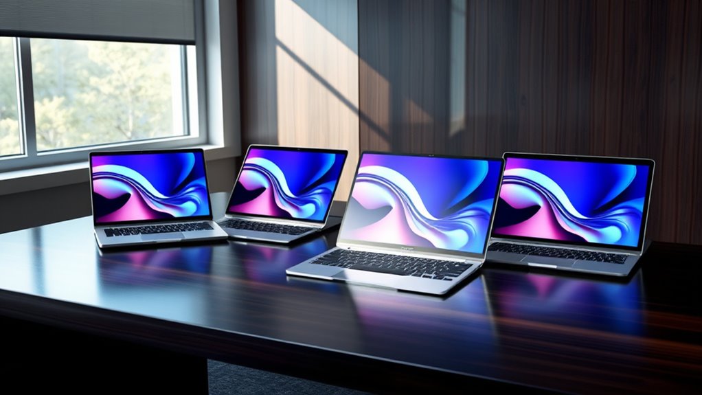 High-end 2-in-1 laptops deliver exceptional performance by packing powerful processors like Intel Core i7 or AMD Ryzen 7, guaranteeing smooth multitasking and rapid responsiveness. Ample RAM, typically 16GB or more, allows seamless switching between applications and handles demanding workflows without lag. Fast storage options, such as NVMe SSDs with capacities of 512GB or higher, markedly cut down boot times and load applications swiftly. Advanced graphics, either integrated or dedicated, deliver smooth visuals needed for creative work and media editing. Additionally, optimized system architectures and connectivity technologies like Wi-Fi 6E and Bluetooth 5.3 enhance overall performance and guarantee stable connections. These features collectively make high-end 2-in-1 laptops powerful tools for productivity, creativity, and entertainment.