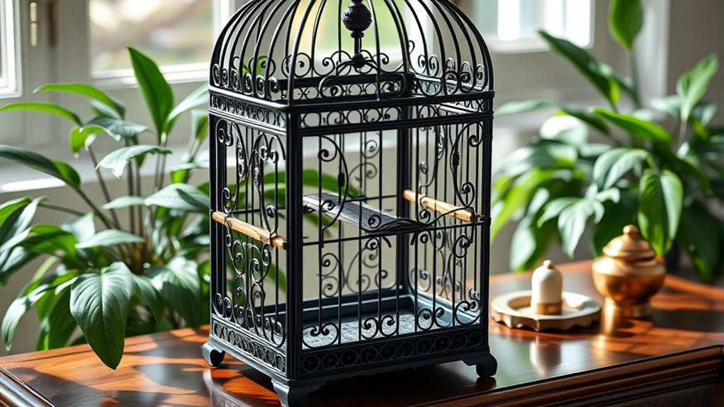 Choosing a high-end bird cage means prioritizing durable materials like wrought iron, stainless steel, or powder-coated metal that resist rust and corrosion. These materials guarantee the cage maintains its integrity over time, even with exposure to moisture and cleaning. Safety is equally vital; non-toxic, bird-safe finishes and coatings prevent harmful fumes or chemicals from harming your feathered friend. The strength of the bars and joints must withstand active birds’ biting and pecking, reducing escape risks and structural failure. Reinforced welds and high-quality construction eliminate sharp edges, broken welds, or loose parts that could injure your bird or yourself. Materials like powder coating also make cleaning easier without degrading or releasing hazardous particles, guaranteeing longevity and safety.