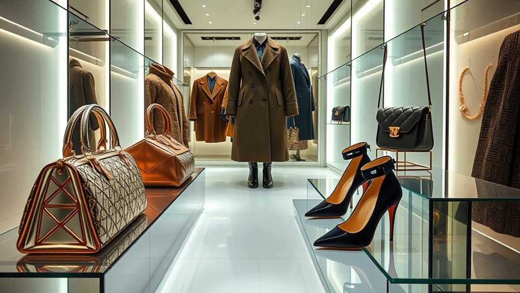 Think of luxury fashion materials as the backbone of elegance and resilience. In 2025, I believe that sustainably sourced leather, reinforced with advanced composites, define durability best. Titanium and carbon fiber also play a vital role, offering strength without weight. These materials guarantee that high-end pieces aren’t just beautiful but built to last, embodying a perfect harmony between luxury and longevity that I find truly inspiring.
