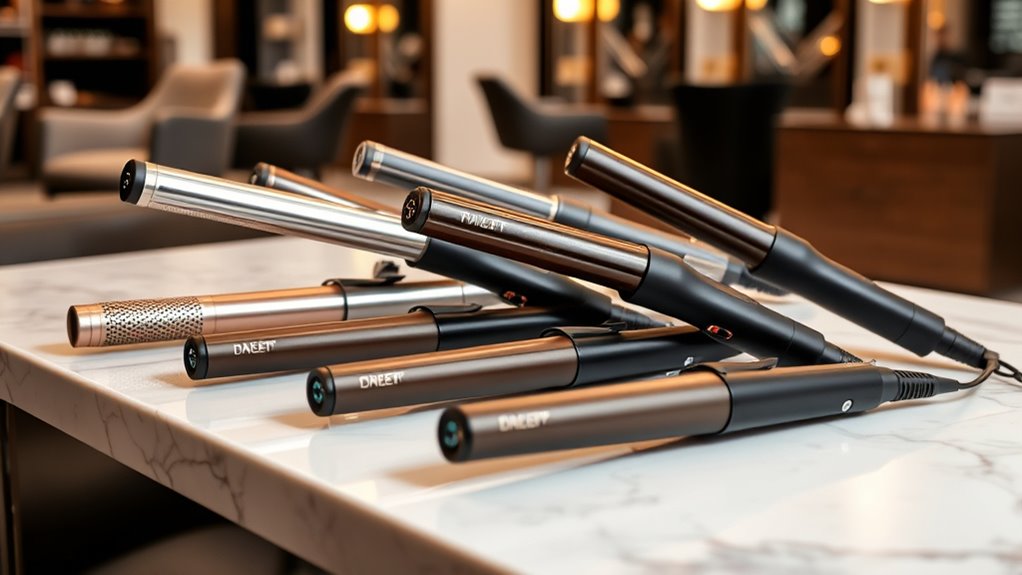 Choosing high-end hair curlers and wands depends heavily on their material quality and coating, as these elements determine how evenly heat is distributed and how gentle the tool is on hair. Ceramic, tourmaline, and titanium coatings are common, each offering distinct benefits. Ceramic coated tools, especially those infused with tourmaline, emit negative ions that reduce static, frizz, and boost shine, resulting in smoother curls. Titanium barrels heat rapidly and maintain consistent high temperatures, making them perfect for thick or coarse hair that needs long-lasting hold. Superior coatings are durable, resistant to cracking or peeling, and extend the tool’s lifespan. Most importantly, high-quality materials guarantee gentle heat, minimizing damage and preserving hair moisture, giving you salon-quality results with less stress on your strands.