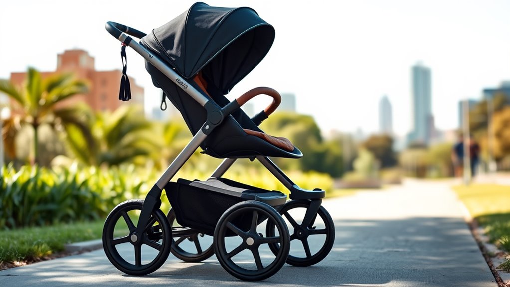 If you’re looking for the best high-end jogging strollers that blend luxury with rugged performance, I’ve got you covered. I focus on models with all-terrain wheels, superior suspension, adjustable handlebars, and premium fabrics that handle sand, snow, trails, and city streets with ease. These strollers also prioritize safety, comfort, and style for both parent and child. Keep exploring to discover the top options that combine durability, elegance, and active versatility for your busy lifestyle.