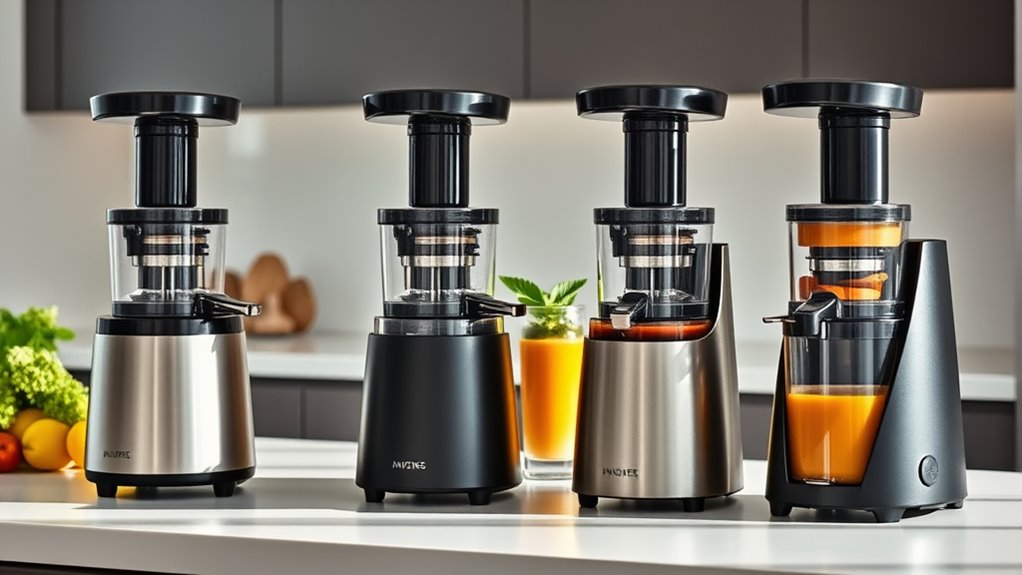 If you want studio-quality juice at home, I recommend high-end juicers that use cold press technology, large feed chutes, and durable construction. These machines offer maximum nutrient retention, high juice yields, and easy cleaning. Features like wide mouths, powerful motors, and adjustable pulp controls make them perfect for fibrous produce and quick batches. If you keep exploring, you’ll discover the top models that combine performance, safety, and longevity for a perfect juice experience.