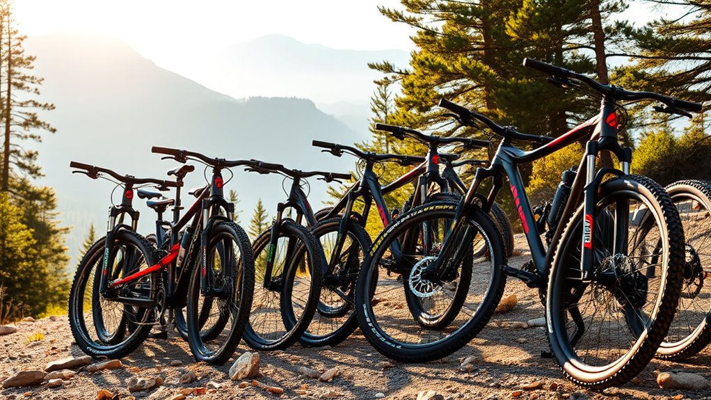 Lighter mountain bikes made with high-grade aluminum or carbon fiber frames considerably improve maneuverability by reducing rider fatigue and making handling on technical trails easier. When a bike weighs less, I find it easier to control during sharp turns or quick directional shifts, which is essential on challenging terrain. The overall weight influences agility; a heavier bike demands more effort for acceleration and braking, hindering quick responses. Bikes with balanced weight distribution enhance stability, especially on steep inclines and uneven paths. Combining a lightweight frame with responsive components like fast-rolling tires and efficient suspension boosts maneuverability further. Excess weight from bulky frames or heavy parts can make quick maneuvers difficult and increase rider fatigue, so prioritizing weight reduction is key for serious riders seeking ideal agility.