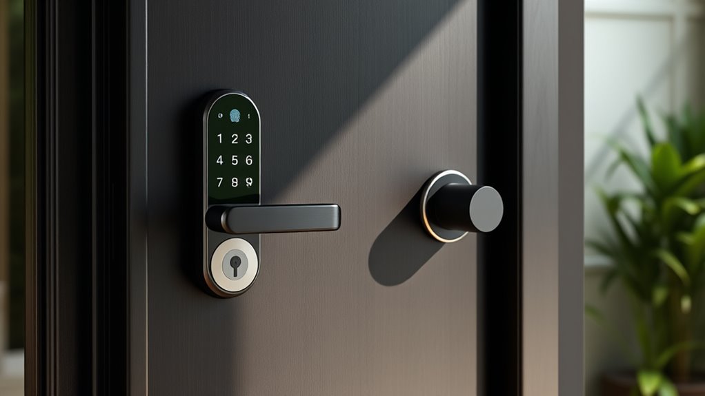 Connectivity and app control are essential features that determine how seamlessly I can manage my smart lock. Most high-end models use Wi-Fi or Bluetooth, allowing me to lock or access remotely through dedicated apps. Many also support voice assistants like Alexa or Google Assistant, making hands-free operation simple. Secure app controls provide real-time notifications, activity logs, and the ability to grant or revoke access remotely—perfect for managing guests or service providers. Reliable connectivity depends on a stable Wi-Fi connection, and some locks support dual-band networks (2.4GHz and 5GHz) for greater stability. Additionally, advanced locks may incorporate protocols like Matter, Zigbee, or Z-Wave, ensuring compatibility with broader smart home ecosystems. This connectivity makes managing my lock convenient, secure, and integrated into my smart home.