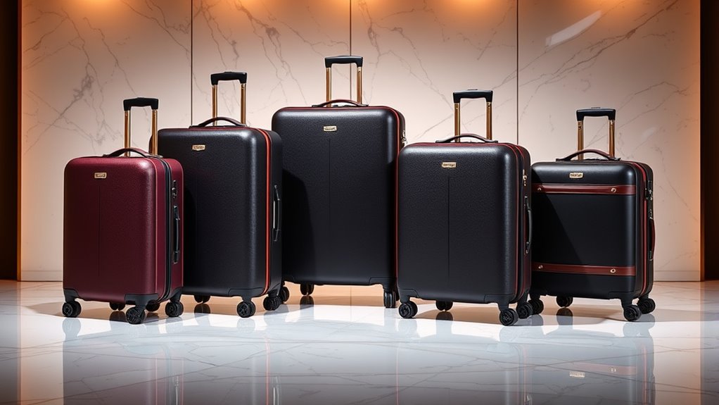 Selecting the right style and color for high-end travel luggage sets can enhance your travel experience by reflecting your personal taste and making your bags easily identifiable. Luxury luggage often offers a variety of finishes, like metallic, matte, or textured surfaces, to suit different aesthetics. Vibrant hues such as teal, purple, or red add a bold touch, while classic shades like black, navy, and beige ensure easy recognition at baggage claims. Many brands coordinate accessories like toiletry bags and backpacks for a cohesive look. Some offer customizable or limited-edition options, allowing you to express your uniqueness. The visual appeal is further elevated by embossed patterns, metallic accents, or glossy finishes, which not only boost style but also enhance perceived quality, helping your luggage stand out stylishly and effortlessly.