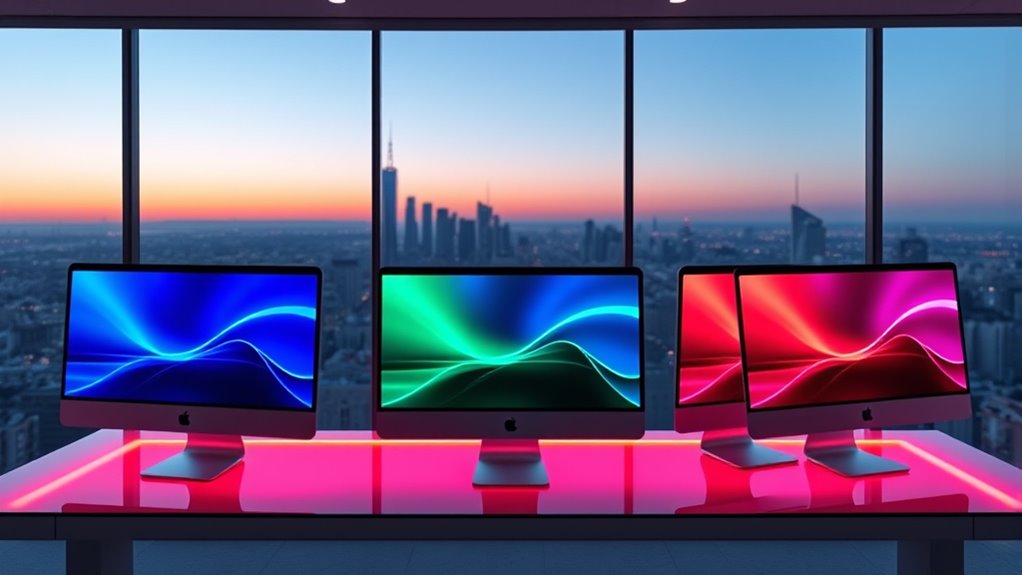 If you’re a power user working from home in 2025, I recommend exploring the top six iMacs with the new M4 chip. These models offer incredible processing power, stunning 4.5K Retina displays, and sleek designs that fit well into modern workspaces. They come with advanced connectivity options, strong security features, and ample memory for demanding tasks. Keep going to discover which one best matches your needs and setup.