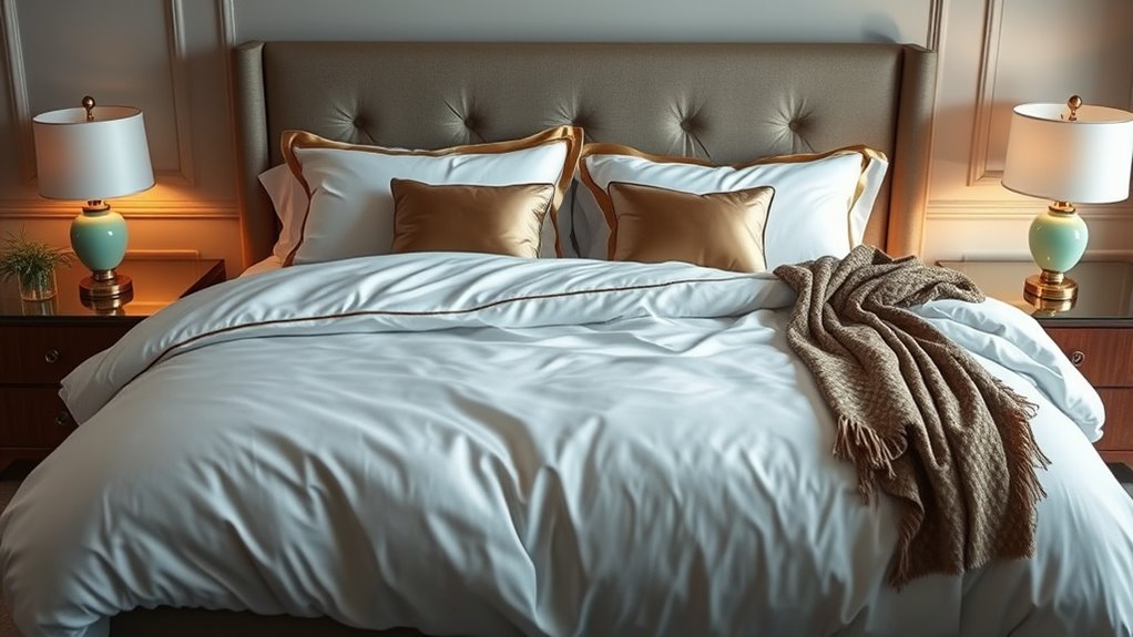 Think of your bedroom as a sanctuary—a peaceful lake at dawn, calm and inviting. Choosing the right luxury bedding sets is like selecting the perfect stones to create that tranquil reflection. When you find the one that feels just right, it transforms your space into a retreat where worries dissolve, and serenity takes hold. Remember, your bedding is the gentle ripple that turns your nightly rest into a tranquil escape.