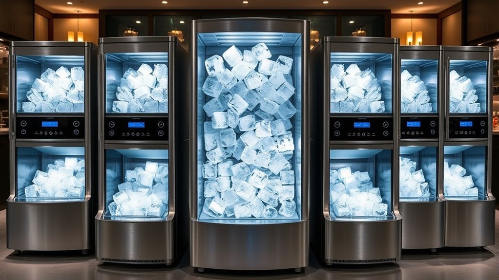 Think of energy efficiency as the secret ingredient that keeps your ice machine running smoothly without draining your wallet. Yes, frequent use requires models with good energy ratings to save power and reduce costs. I always look for machines with Energy Star certification, as they’re designed to be eco-friendly and cost-effective. Investing in a high-efficiency ice machine means you get perfect frozen treats without worrying about high energy bills.