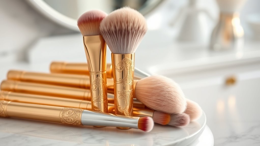 Have you ever wondered how your luxury makeup brushes stay pristine after multiple uses? The secret lies in their durability and how well you care for them. Quality brushes often have densely packed synthetic or natural bristles that resist shedding and keep their shape, even after many washes. Using gentle, brush-specific cleansers is key to removing product buildup without damaging the bristles, which extends their lifespan. Regular cleaning also prevents bacteria buildup, reducing skin breakouts and ensuring hygenic application. Look for brushes with sturdy handles and secure ferrules, as these prevent loosening or detachment over time. Additionally, choosing brushes made from easy-to-clean materials makes maintenance simple, keeping your tools in top condition and ready to elevate your beauty routine for years to come.