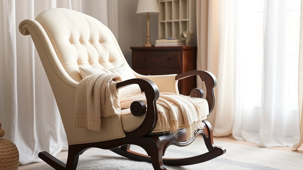 Material quality plays a key role in ensuring your nursery rocking chair remains beautiful and comfortable over time. I look for chairs built with durable materials like solid wood frames, reinforced joints, and high-quality finishes such as polished or painted surfaces. Premium upholstery fabrics, such as Teddy velvet or cashmere, add both elegance and resilience, resisting wear, pilling, and fading. Soft, skin-friendly fabrics filled with high-density foam or feathers provide plush support and comfort during long hours of sitting. Choosing materials that meet safety standards guarantees a safe environment for both parent and child. Longevity and aesthetic appeal depend on these high-quality materials, so I prioritize durability and safety features when selecting a luxury nursery rocking chair that will stand the test of time.